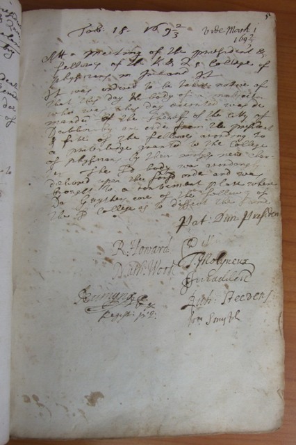 Harriet Wheelock / Tuesday 27 July 2010 Archive Item of the Month, July 2010 – The first College Minute Book This not terribly exciting looking volume contains one of the oldest items in the College archive; in a much later binding it holds the first set of College minutes. In 1692 the College, which had been established in 1654, petitioned King William III and Queen Mary II for a new charter, this was granted on 15 December 1692 and established the King and Queen's College of Physicians in Ireland. The charter limited the number of Fellows to 14, who were to hold office for life, unless they were removed for misdemeanours or non-residence. Unlike the previous charter, the 1692 charter did include discriminations against Catholics, due to the fear of Irish Catholic support of a Jacobite restoration. Seven fellows were nominated in the Queen's letter that accompanied the charter, they were Patrick Dun (President), Charles Willoughby, Ralph Howard, Christopher Dominick, John Madden, Duncan Cuming and Thomas Molynex; these seven were to name seven others to join them as fellows.[1] The first meeting of the newly reorganised college was held on 1 January 1692/3. The minutes in the volume give the date of each meeting, a brief summary of the business discussed, and the signatures of those fellows present. The minutes of one of the early meetings shows that it was not just the set up of the College that had changed; the new charter also gave the College new rights: 'Feb. 18 1692/3. At a meeting of the President and Fellows of the King and Queen's College of Physicians in Ireland. It was ordered to be taken notice of that this day the body of a malefactor who was this day executed was demanded of the Sheriff of the City of Dublin by order from the President and five of the Fellows according to a priviledge granted to the College of Physicians by their majesties' new charter. The said body was accordingly delivered upon the forsd. order and was brought to a convenient place were Dr. Gwyther, one of the Fellows of the said College is to dissect the same.'[2]The 1692 Charter allowed the College to dissect the body of six executed criminals each year, as long as they were decently buried. This was not the first time that dissections had taken place in Dublin, or indeed in the College, but the 1692 Charter was the first time that a formal grant for dissection in Ireland had been made. [3] [1] Wildness, J D H, The History of the Royal College of Physicians of Ireland (1963) [2] Minute Book of the King and Queen's College of Physicians, 1692/3 – 1717 [3] Hopper, A C B, 'Dublin Anatomy in the 17th and 18th Centuries', Dublin Historical Record, Vol. 40, No. 4, Sep. 1987 Images: * First Minute Book of the King and Queen's College of Physicians * Engraving of King William III and Queen Mary II * Minutes of meeting 18 February 1692/3 All from the Royal College of Physicians of Ireland Archive.