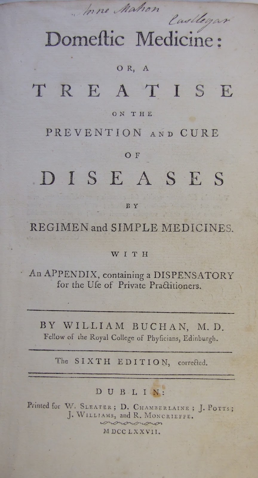 Dun's Library holds copies of seven different editions of this book, ranging from the 3rd (1774) to the 21st (1813), all except one printed in Dublin. The copy of the 6th edition of 1777 has the name "Anne Mahon, Castlegar" written on the title page. She was part of the Mahon family, who loved on the extensive Mahon Estate in Castlegar, Co. Galway, and would have been a typical user of Buchan in her care of her family and servants.
