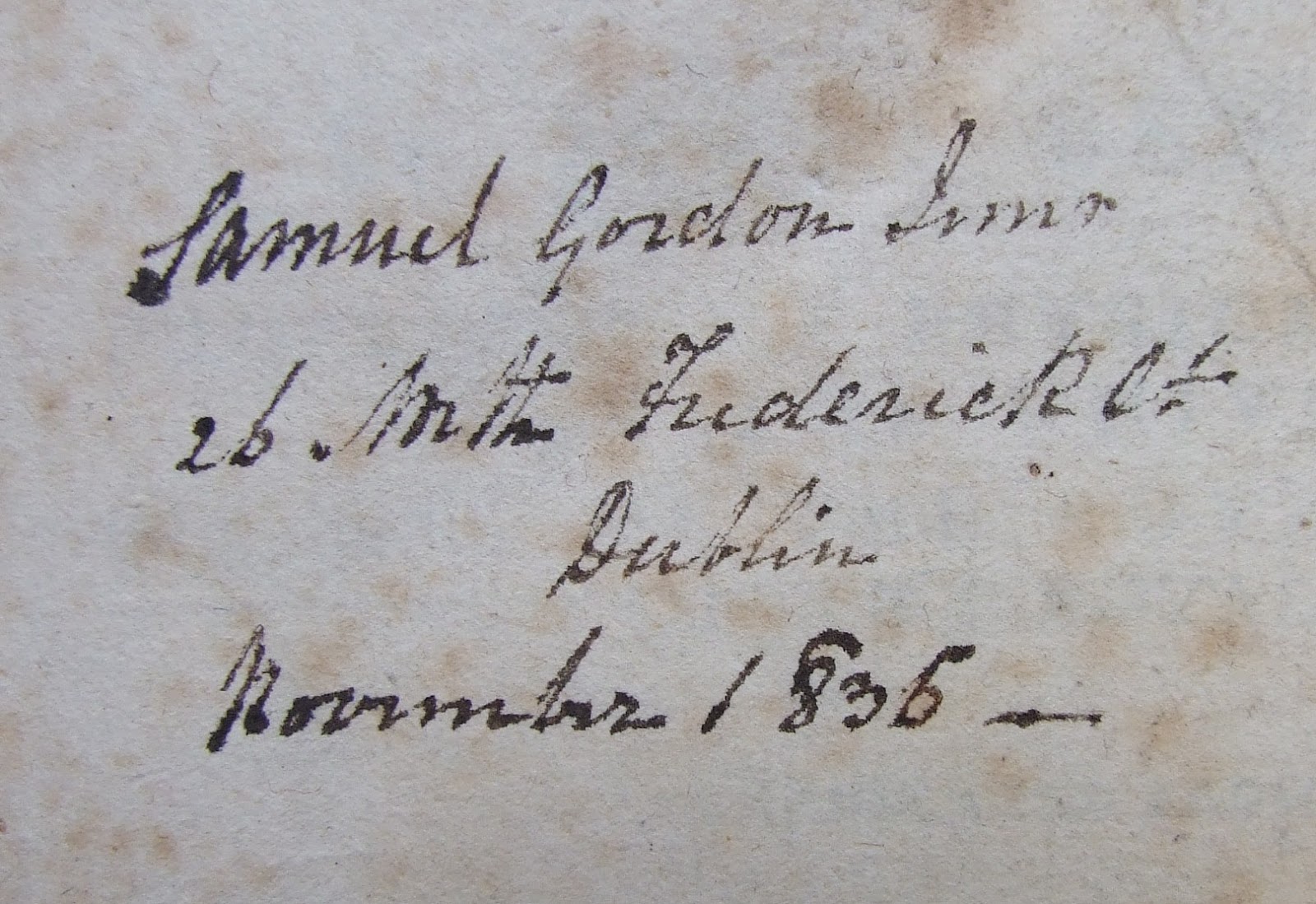 The interest in this particular volume lies in the MS inscription on the fly leaf which indicates that the book was owned by 'Samuel Gordon Jnr, 26 Nth. Frederick St., Dublin' in November 1836.