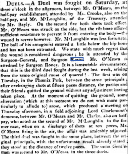 Harriet Wheelock / Friday 17 August 2018 Guest post: Surgeon James Kerin (1779-1848) - Part II Today we have the second part of Sylvia Turner's guest post on Surgeon James Kerin. If you missed part one you can catch up here. Role as a surgeon Trade directories list Kerin as a surgeon working from 9 Great George Street South. Two incidents in the Press cite Surgeon Kerin, as he was called, and give a sense of those times. A series of duels was fought in 1822 between a Mr O’Meara and a Mr MacLoughlin and the latter was seriously wounded by a bullet. Kerin, along with the Surgeon-General was named as attending MacLoughlin, who did make a recovery. MacLoughlin was later hung for the murder of his step-father and the reports give extensive detail of his original wound. Dublin Weekly Register Saturday 19th January 1822 In 1832, Kerin attended Mr Carew O’Dwyer, a barrister, who was suffering from cholera and the patient made a full recovery. Cholera was rife in Ireland in that year. It was still not known that its chief cause was contaminated drinking water so a cure would be based on alleviating its symptoms of chronic diarrhoea and vomiting. Kerin himself fell victim to the disease the following year and was successfully treated by Henry Marsh and Robert Graves. Dispensary role and work at Mercers’ Hospital Apart from paid work, Kerin worked at the Dublin General Dispensary. He is regularly cited in the Press in the monthly reports that were published. For example, he is identified as the medical attendant for the month of April 1833. The first evidence of this work comes in 1818 when it was reported that he, with the apothecary, Mr McCarthy, saved a man who would have appeared to attempt suicide by jumping into the River Liffey the previous day. The dispensary had been established in 1785 under the patronage of the Duke of Leinster and Lord Donoughmore, acting as President and Vice-President respectively. It was funded by voluntary subscription. Doctors, unlike the apothecaries in the Dublin dispensaries would not have received pay. Just the previous week on 17th January it was reported that the Dispensary was in a dire financial state. However, Kerin remained at the dispensary for most of his working life and despite retiring from the Dispensary in 1841. He remained as consulting surgeon there until not long before his death. He is listed as such at 11 Holles Street in Slater’s Trade Directory (1846). A report concerning his treatment of a coachman who had fallen from the Kingstown Coach identifies that he worked at Mercer’s Hospital which was founded in 1734 for the sick and the poor initially funded by the will of Mary Mercer. The hospital attracted many eminent clinicians of the time and was supported by the privileged members of Dublin society. Positions of Public Office In 1836 Kerin was appointed as surgeon to the newly established Irish Constabulary. This appoint-ment was heralded in the Press. The Limerick Chronicle referred to his appointment in terms of his family connections. The Dublin Weekly Register carried two reports, the first was from the Evening Packet Newspaper. It noted his character and reputation despite not being a member of the Church of Ireland and holding differing political opinions to the Newspaper. The second report, from the Pilot noted that Kerin had held a similar position as Surgeon to the General Post Office for some time. Personal life As identified by the Evening Packet newspaper, there is no direct evidence of Kerin’s involvement in political activity despite his family background. Apart from his professional activities, Kerin is shown to engage in activities as befitting of a gentleman of his time. Information is sparse but reveal he acted in a play at a Ball hosted by Lady Stewartha Howard in Rutland Square, Dublin in April 1818. and attended the Castle at social events such as a ‘Levee’ and ‘Drawing Room’ event hosted by His Excellency Lord Lieutenant who was the Monarch’s representative in Ireland. Kerin would seem to have an interest in education. He was one of the ‘noblemen and gentlemen’ on the Committee in 1820 for the Feinaiglian Institute (1813-1830). Also, he was involved in the formation of Hibernian Society in Dublin. In 1840 Kerin married Catherine Staunton of Kingstown. Kerin would appear to have had an early association with the Staunton family who originated from Ennis, County Clare as did the O’Loughlen family. Kerin and Staunton are both to be found at the same events such as the Kings-town Benefit Society in 1837. Both families were strong supporters of Daniel O’Connell. Michael Staunton (1788-1870) was a politician who became the Lord Mayor of Dublin in 1847 representing the Repeal Association, as did O’Connell 1841-2. Both Kerin and Staunton were pall bearers at the funeral of Michael O’Loughlen in 1842. Kerin died of pneumonia, aged 68 on 17th of March 1848 at the Constabulary Barracks in his house in Phoenix Park. He left no will. He is buried in the Staunton family crypt at Glasnevin cemetery. The memorial stone has no inscription. His possessions were removed from the Barracks and sold by auction the following month. The life of James Kerin has been largely forgotten. However, he was a man who achieved much in his life. He gained both professional recognition from his colleagues and was appointed to posts of national importance. His wife, Catherine died in Kingstown in 1883 aged 87. They had no children. Syliva Turner