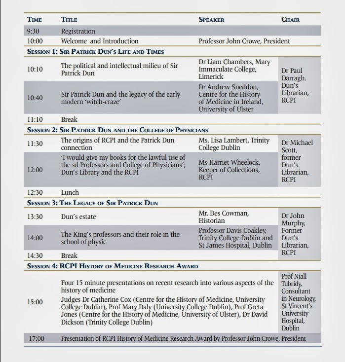 To commemorate the 300th anniversary of Dun's death, RCPI's Heritage Centre will be holding a series of lectures which will explore various aspects of Dun's life and legacy, from the social and intellectual climate of his day, to Dun's brush with the early modern 'witch-craze'. The day will also see the third annual RCPI History of Medicine Research Award, which aims to encourage research into the history of medicine in Ireland, and to promote public interest.