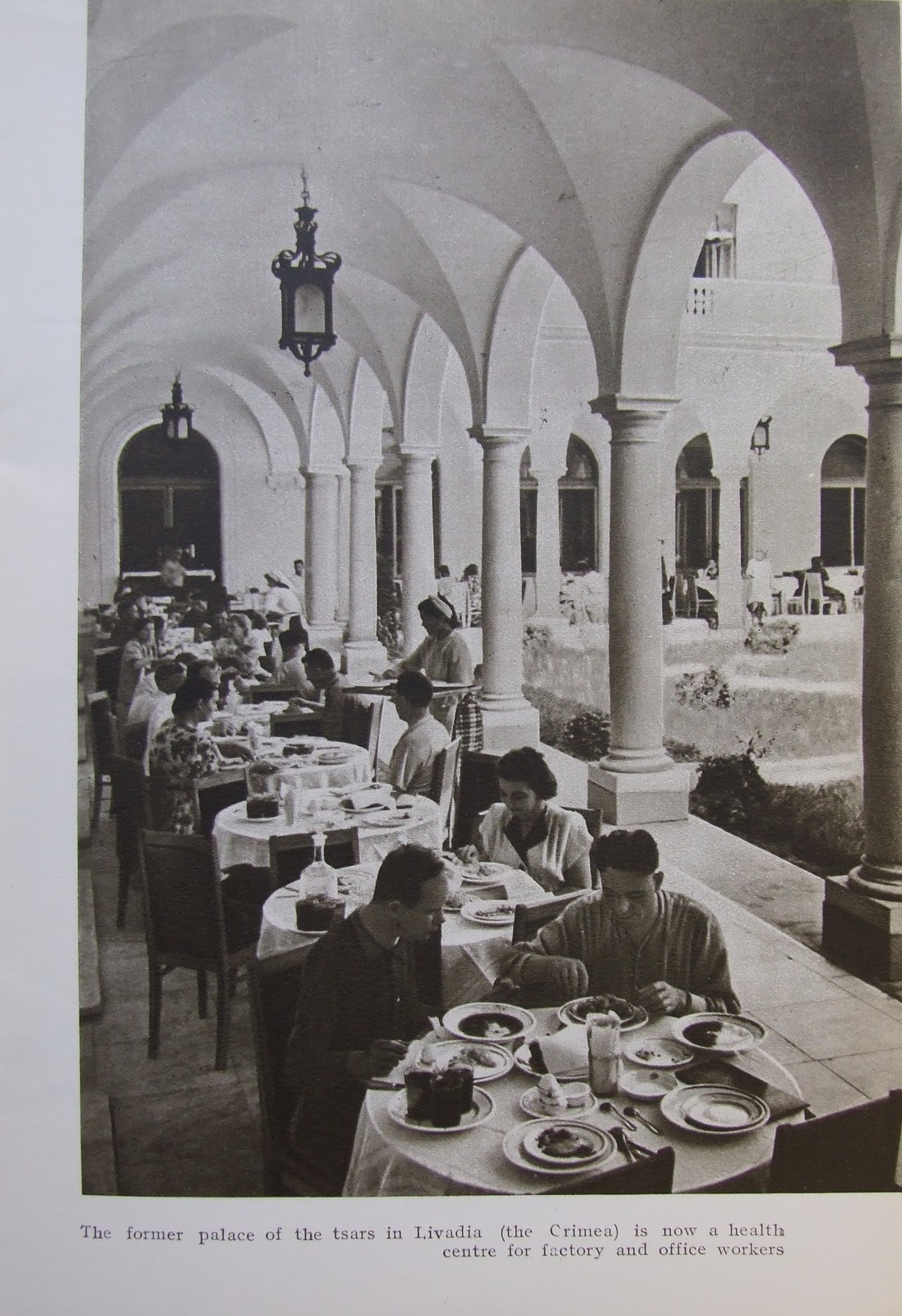 In the USSR brochure the Communist message is clearly seen; factory and office works are shown relaxing in the former palaces of the Tsar, and the booklet shows that even Georgia's radioactive springs have benefited from the advent of Communism.