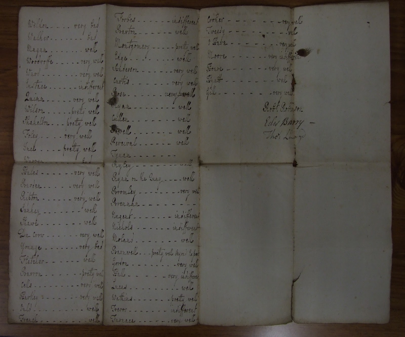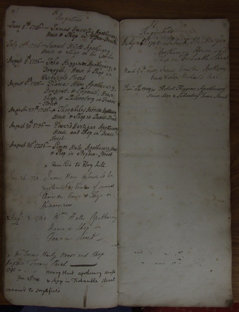 The bundle of papers contained 29 reports from the period 1743 to 1862, as well as several other related documents. Each report contains the name of the shops inspected and a comment on the nature of the shop. In the early reports this is limited to a one word remark such as well, very well or indifferent, but the later reports contains more details on the shops. Another interesting item in the College's Archive relating to Dublin Apothecary Shops is a book containing a register of Apothecaries in Dublin between 1736 and 1756. Given that the Dublin Trade Directories only started in the 1750s, this is one of the earliest lists of Apothecary Shops.