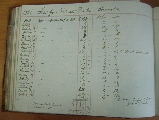 This page showing Corrigan’s daily income for December 1866, when combined with the number of patients he visited, recorded in the observations column, it can be seen that Corrigan charged £1 for each consultation, the standard fee at the time.[2] At the bottom of the page Corrigan records his yearly income, in this case £4831.10, with the majority (£4,737) coming from his private practice. Corrigan used the observation column of the book to records details of his patients, but he also noted down events in his own life in this case that he saw no patients after the 19 December as he was ‘confined to bed by gout to 31st instance’