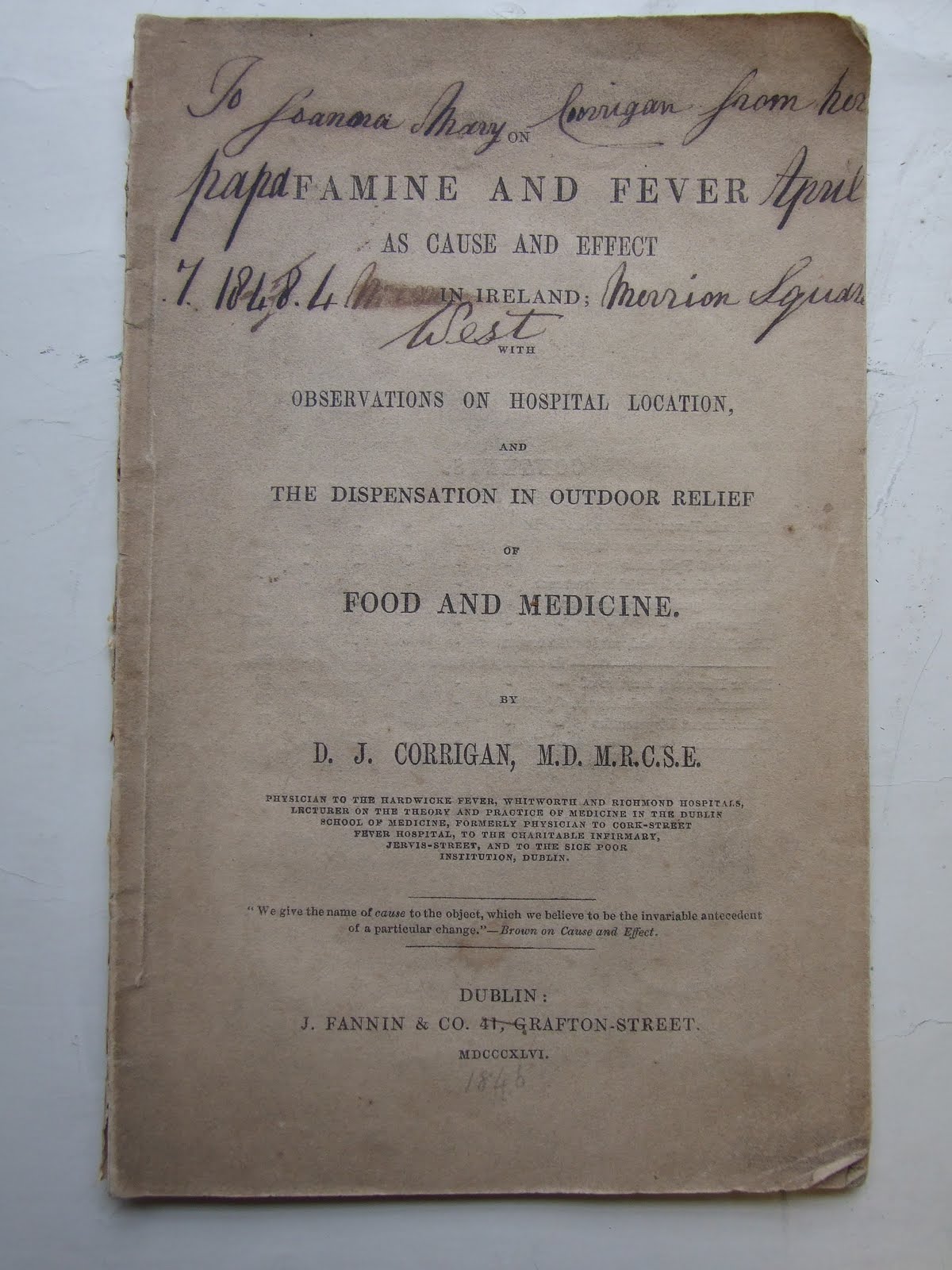 Harriet Wheelock / Monday 18 April 2011 Sir Dominic Corrigan and the Irish Famine Dominic Corrigan was born in 1802, the son of a dealer in agricultural tools. He studied at various Dublin medical schools before graduating from Edinburgh University in 1825. Returning to Dublin Corrigan established himself in private practice, and took up a number of hospital appointments. Working with many of the city's poorest inhabitants he specialised in fever and diseases of the heart and lungs. In June 1840 Corrigan was appointed visiting physician to the Hardwick Fever Hospital, part of the Dublin workhouse. Two of his casebooks from his time at the Hardwick survive in the College's archive. Dating from 1840 to 1846, just prior to the Great Famine, they give details of the numbers and types of cases admitted to the hospital, including cases of typhoid fever. The famine years would see a huge increase in the number of fever patients coming to the hospital. DC/2/4/3 - Hardwick Fever Hospital Case Book DC/6/2/2 In 1846, as reports of the potato blight reached Dublin, Corrigan published a pamphlet on Famine and Fever. By analysing fever epidemics of the previous century Corrigan showed that although contagion, poor sanitation, the climate and poverty were important factors in the spread of fever, the one outstanding common feature was famine. He went on to show that in Ireland the commonest cause of famine was the failure of the potato harvest; 'The people of Ireland are peculiarly liable to become the victims … The effect of competition among a superabundant unemployed population, has been to reduce their wages to the lowest sum on which life can be supported. Potatoes have hence become their stable food … The potato has, I believe been a curse to our country … when a bad crop occurs there is no descent for them in the scale of food: the next step is starvation' Having published his pamphlet Corrigan did his best to have his views widely circulated, sending copies to those with influence and campaigning on the issue himself. In 1852 as the worst effects of the Irish Famine were beginning to pass Corrigan was still actively campaigning for improvements in living conditions and health care for the poor, and for lessons to be learnt from the mistakes of the past. In March 1852 he received a letter from George Villers, 4th Earl Clarendon and Lord Lieutenant of Ireland discussing both the Irish Famine and free trade. In it Clarendon wrote that 'experience had been brought in Ireland at a painfully high price but will it avail? If the potatoes come back will not the people go more than ½ way back to them? I greatly fear it & that many landowners will be short sighted enough to encourage a return to the old system under the temptation of high rents that will not be paid' DC/5/6 - Letter from the Earl of Clarendon, 30 March 1852 Corrigan's involvement in attempts to counter some of the worst effects of the Irish Famine led him into conflict with other member of the medical profession. In particular his involvement in the Board of Health, established in 1846, and the question of the level of pay for doctors working for the Board. This disagreement seems to have been the reasons why, in 1846, his bid to be elected an Honorary Fellow of the King and Queen's [now Royal] College of Physicians of Ireland failed. In 1855 Corrigan outflanked this opposition by sitting the licentiate exam with the newly qualified doctors, including many of his own students. The following year he was elected a Fellow and in 1859 became the first Catholic President of the College.