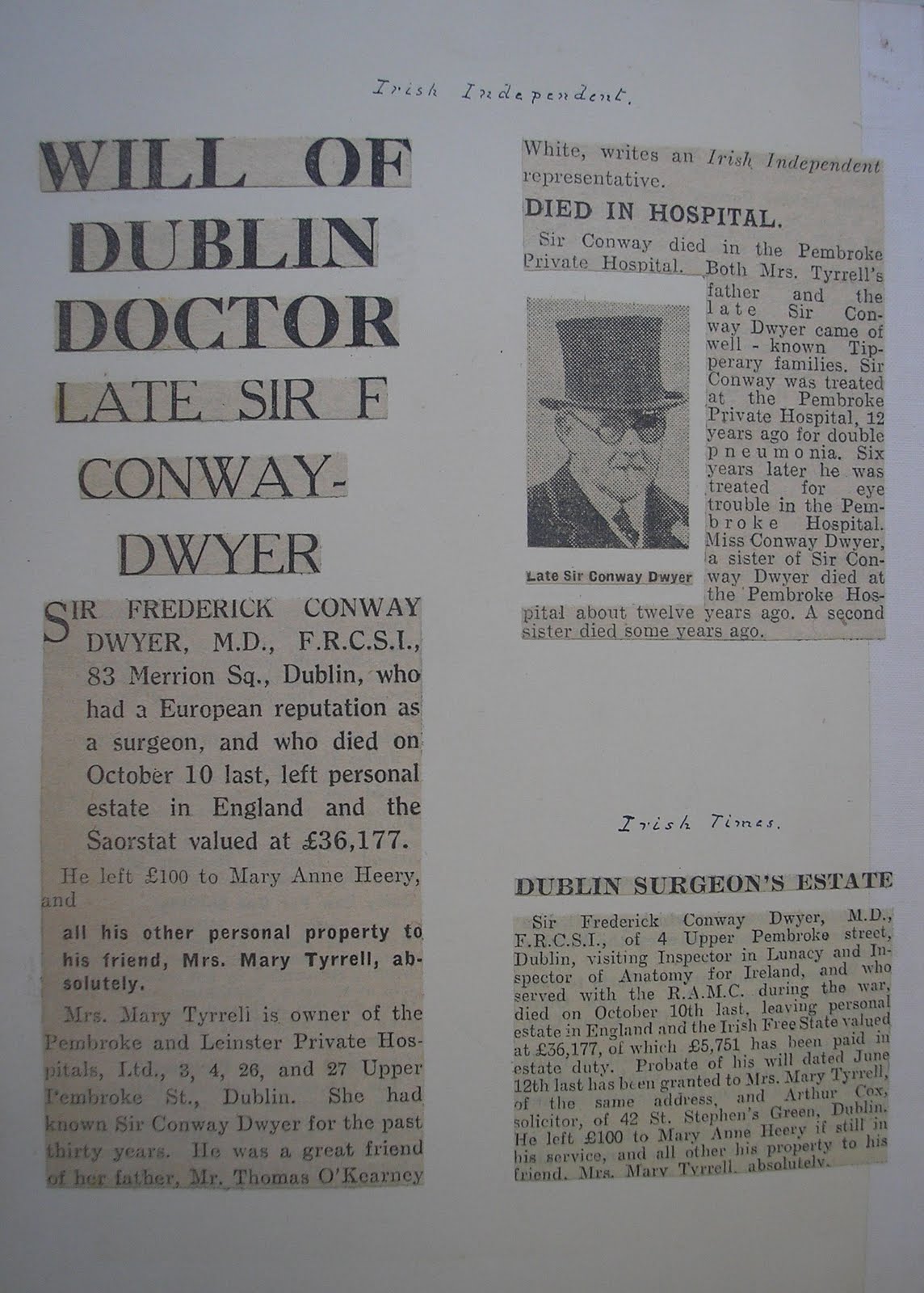 Given Dwyer's obvious association with the College of Surgeons, it is perhaps surprising that the College of Physicians holds this item, but events following his death led to a posthumous connection with the College of Physicians. As the Irish Independent and Irish Times both reported, Conway Dwyer left the majority of his fortune (over £36,000, the equivalent of over £1.5 million in today's money) to his friend Mrs Mary Tyrell. She is described in the articles as the daughter of his great friend Thomas O'Kearney White and also the owner of the nursing home in which Conway Dwyer died. His Will seems to have caused a bit of a stir, and there was a certain amount of speculation about Mrs Tyrell. Within the volume of cuttings there is a printed apology from one newspaper;