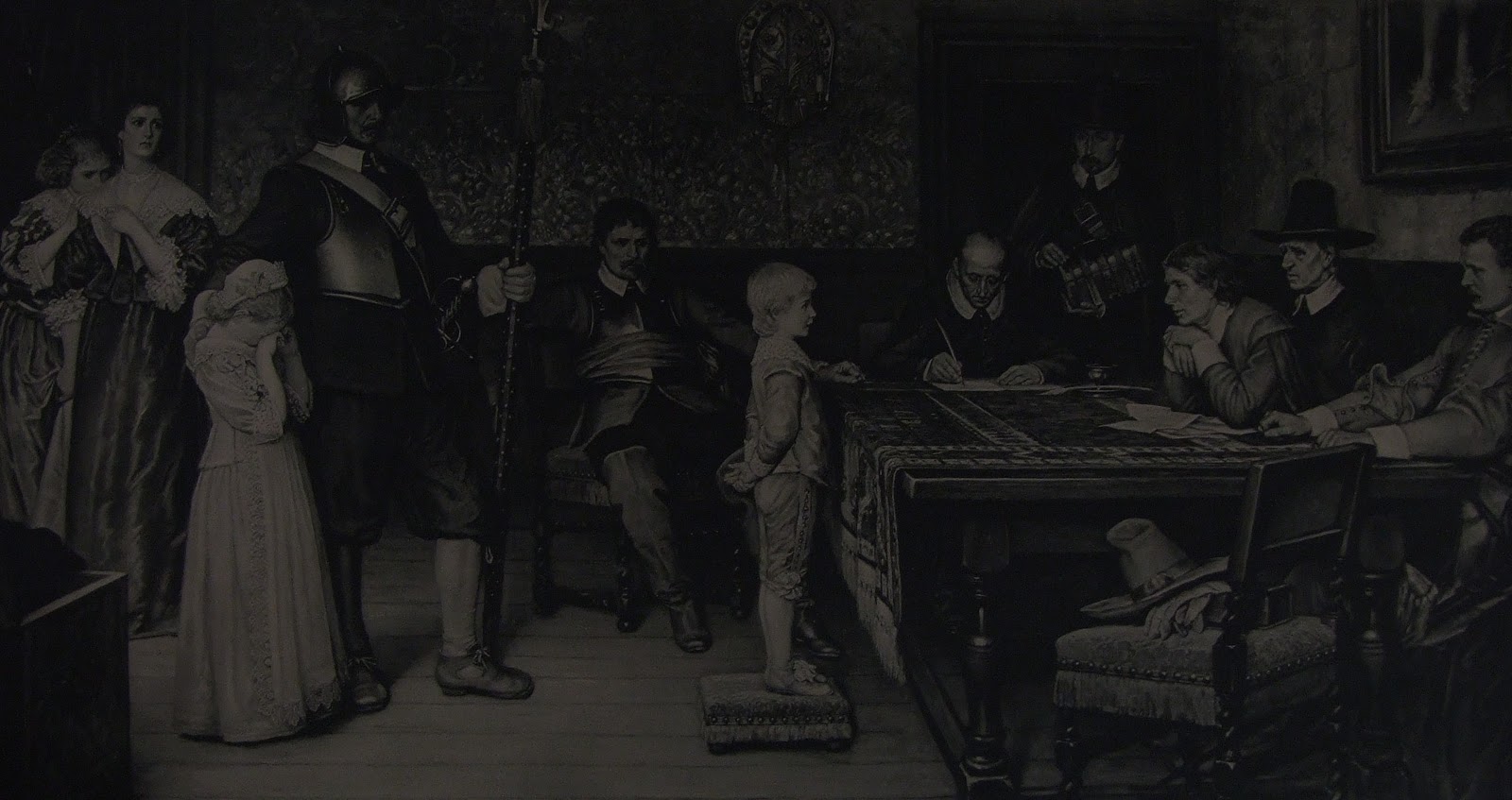 Image - 'And when did you last see your father?' mezzotint showing Cromwellian soldiers interogating a Royalist family. VM/1/3/1