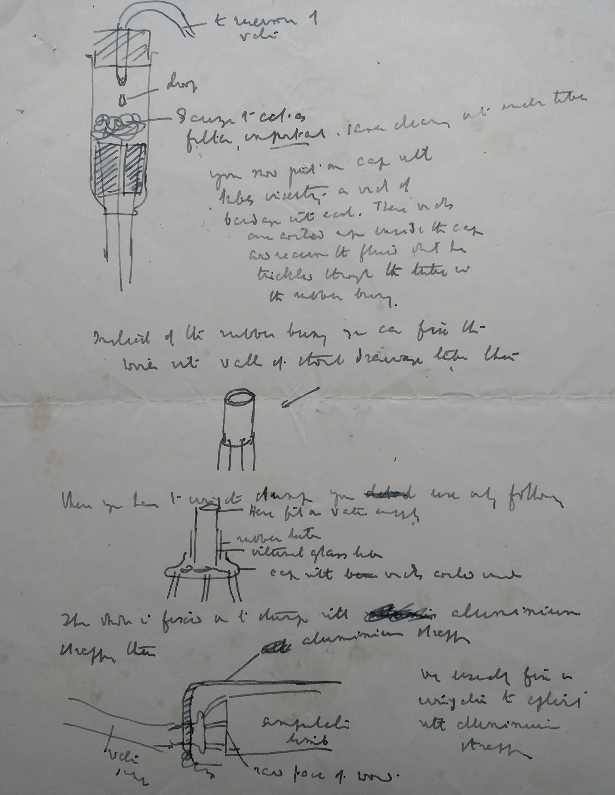 The majority of the letters date from the First World War, when Wright was working for the British Army, based in Boulogne. During this time Wright carried out research into inoculation and wound treatment, he also proposed mass vaccination programmes to prevent the spread of easily preventable diseases. Wright’s relationships with the other medical officers during the War years seemed to be quite tense: not that surprising given their surroundings and purpose. A number of Wright’s colleagues seemed to have resigned their positions in Boulogne, attributed by Wright to their incompatibility with their colleagues. In several letters, Wright described complex theories and experiments alongside records of ordinary life. In one letter Wright discussed and drew diagrams of the Rose Irrigator, a tool to continuously supply fluid at a steady temperature to a wound, while also discussing the renting of his cottage, which Colebrook was looking after. Wright was dismayed to hear that the tenant had answered the door to Leonard Colebrook in her nightgown!