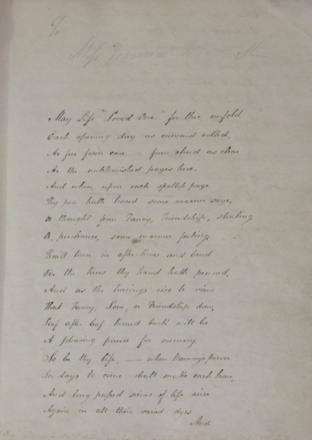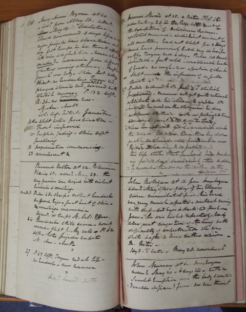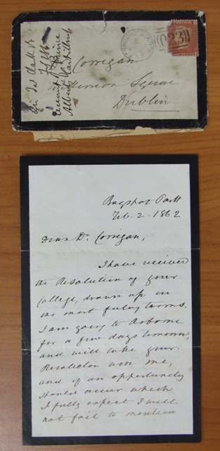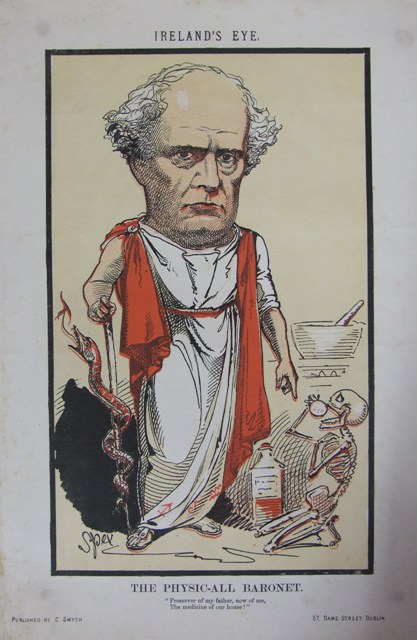 Harriet Wheelock / Wednesday 9 June 2010 What’s in the Corrigan Papers? This week I have finished cataloguing the papers of Sir Dominic Corrigan, and the collection is ready for use. As the online catalogue is not yet available, the list can at present only be accessed in the reading room. In cataloguing the papers I have divided them into seven sections based on record type – Personal and family papers; Medical Career; Medical Legislation; Reform of education in Ireland; Other correspondence; Published works and Caricature. Within these sections the material is further sub-divided and arranged chronologically. Personal and family papers contains a number of Corrigan's diaries, including one recording a visit to the Continent. The section also contains material relating to, or created by, other member of the Corrigan family. This includes a book of poetry collected by Corrigan's wife Lady Joanna Corrigan, including a poem written by Corrigan to her shortly before their marriage, and biographical material on Corrigan collected by his daughter Lady Mary Martin. This section also contains papers relating to Corrigan's grant of arms and baronetcy. Medical Career covers Corrigan's education, see earlier post, as well as letters of application for hospital positions. This section contains Corrigan's fee book and three case books, covering Corrigan's private practice and his work in the Hardwick Fever Hospital. These case books record the name, age, address and profession of the patient, as well as details of their medical history and current illness, with later details of the outcome of the case. The section also contains items relating to Corrigan's lecturing career, mainly the scripts of lectures he gave to medical students. Material under Medical Legislation covers three pieces of legislation; the Pharmacy Act (Ireland) 1875, the proposed Medical Charities Ireland Bill (1842), and the Medical Act (1858) and subsequent amendment acts. The papers in this section clearly demonstrate Corrigan's strong views on the legislation, especailly in realtion to medical education, as well as the considerable influence he had with leading politicians. Corrigan was a strong proponent of reform of education in Ireland, advocating a secular education system which would allow equal opportunity to all religions. This position brought him into conflict with the leaders of his own church, as the Catholic Clergy, led by Cardinal Cullen, wanted state funding for Catholic controlled education at all levels. This section contains correspondence and papers relating to the question of educational reforms and the pamphlet Corrigan published on the subject in 1865. It also includes correspondence with W E Gladstone over his ill fated University Education (Ireland) Act. Other correspondence contains individual or small collections of letters, not relating to the previous three sections. The topics are diverse, ranging from a letter from the Quaker MP John Bright on the Irish Land Question to a letter from Sir James Clark, Physician-in-Ordinary to the Queen detailing the last illness and death of Prince Albert. The sixth section contains some of Corrigan's published works, including newspaper articles, pamphlets and books. Corrigan was a prolific writer and this is not a complete collection of his published works, a much more extensive collection can be viewed in the Dun's Library. The final item in the collection is a caricature of Corrigan published in Ireland's Eye in 1874. The caricature shows Corrigan in Grecian robes with the rod of Asclepius, associated with medicine and healing. Under the title, The Physic-all Baronet, are two lines from Shakespeare's A Winter's Tale. The Corrigan papers are a very important collection, tracing the career of one of the leading Irish physicians of his day, and they shed important light on the history of medicine in Ireland during the middle of the nineteenth century. Corrigan's case and fee books give an insight into his professional career, and the lives of some of his patients. As well as their importance to the history of medicine, the papers are also relevant to the study of wider political and social changes. Corrigan was MP for Dublin for 4 years; he campaigned for reform to education in Ireland, the early release of Fenian prisoners and was an active supporter of the temperance movement, all of which topics are covered in the collection. He was also the first catholic to hold some of the most important positions open to members of the medical profession in Ireland. Finally the papers give a brief glimpse into Corrigan's personal life through his travel diary, the poem he wrote to his wife, and in the writings of his daughter. For an excellent account of Corrigan's life see Eoin O'Brien's 1983 biography Conscience and conflict. A Biography of Sir Dominic Corrigan 1802-1880. To make an appointment to view the Corrigan, or any other, collection please contact me. List of Illustrations 'To Miss Joanna Woodlock', a poem by Dominic Corrigan, c.1829 (DC/1/2/2) Pages 118-9 May 1841, from Hardwick Hospital Fever Case Book, 1840-1846 (DC/2/4/2) Letter from W E Gladstone to Sir Dominic Corrigan on reforms to University education in Ireland, 24 October 1873 (DC/4/4/4) Letter from Sir James Clarke to Dr Corrigan on the illness and death of Prince Albert, 2 February 1862 (DC/5/7) Caricature of Sir Dominic Corrigan, drawn by Spex and published in Ireland's Eye, 1874 (DC/7)