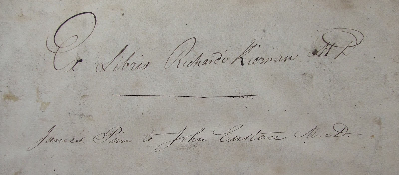 'Ex Libris Richardi Kirwan, MD' and 'James Pim to John Eustace MD'